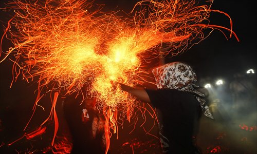 Balinese men throw fire at each other during a sacred ritual called 'Mesabatan Api' at a temple in Tuban, Bali, Indonesia, on Saturday. During the ritual, also known as fire fight, Balinese Hindu men grab blazing coconut husks barehanded, swinging and throwing them at each other. Balinese believe that fire can destroy evil, and the ritual is aimed to get rid of negative forces. Photo: CFP
